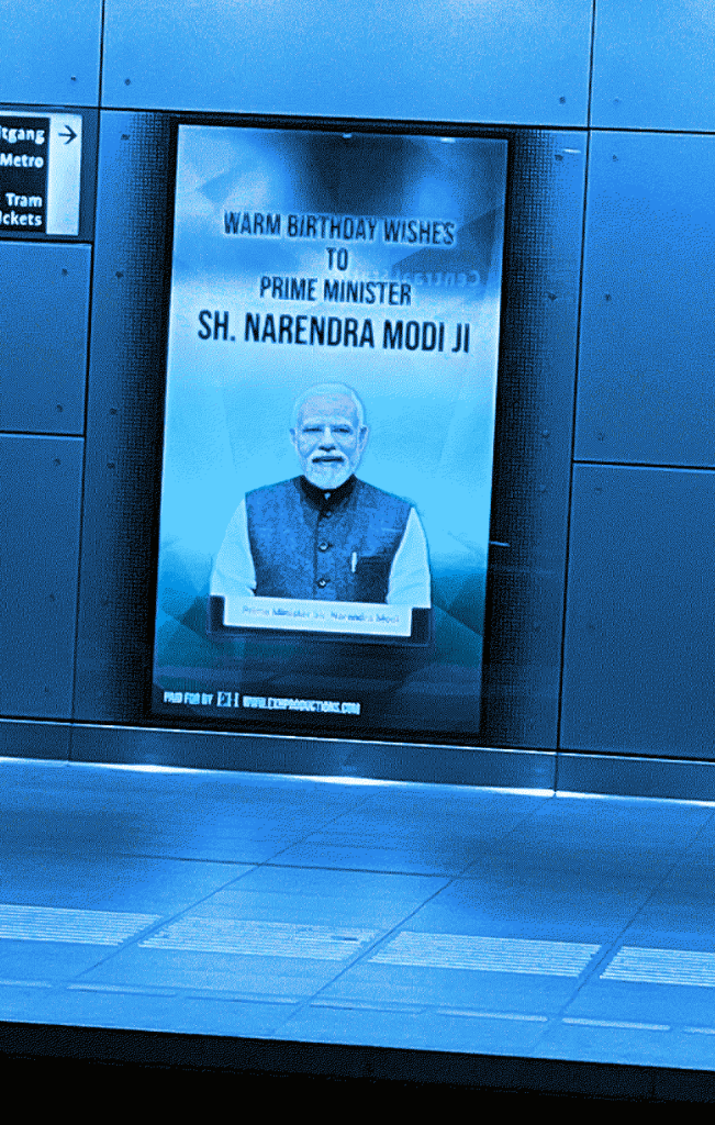 De geruststellende illusie dat Nederland zo’n land zou zijn werd op woensdagmorgen 17 september wreed doorbroken door CS Digital Media (hierna CSDM), het bedrijf dat de digitale reclameborden in de Amsterdamse metro exploiteert. Tijdens de ochtendspits vertoonden de borden van CSDM op de Amsterdamse metro-perrons namelijk een verjaardagswens voor de Indiase premier Modi. De tekst van de felicitatie luidde: ‘Warm birthday wishes to prime minister Sh. Narendra Modi Ji’ (in het Engels, zodat de boodschap niet langs Modi heen zou gaan als hij toevallig besloten had zijn verjaardag op station Isolatorweg te vieren). Het prefix ‘Sh.’ staat naar alle waarschijnlijkheid niet voor ‘slechthorende’, maar voor sjri, een eretitel uit het Sanskriet. Het woord lijkt in betekenis een beetje op het Nederlandse meneer, maar werd ook wel als epitheton voor Hindoe-goden wordt gebruikt. Ook het achtervoegsel ‘Ji’ geeft op het Indiase subcontinent aan dat de voorafgaande naam buitengewoon aanzienlijk of respectabel is. Boven de beleefde felicitatie stond Herr Modi zelf afgebeeld, poserend voor de Indiase tricolore. Voorbijgangers troffen hem aan in een donkerblauw gilet, als ware hij de Asoka Tsjakra, het blauwe wiel dat in het midden van de Indiase vlag staat en symbool staat voor de wet.